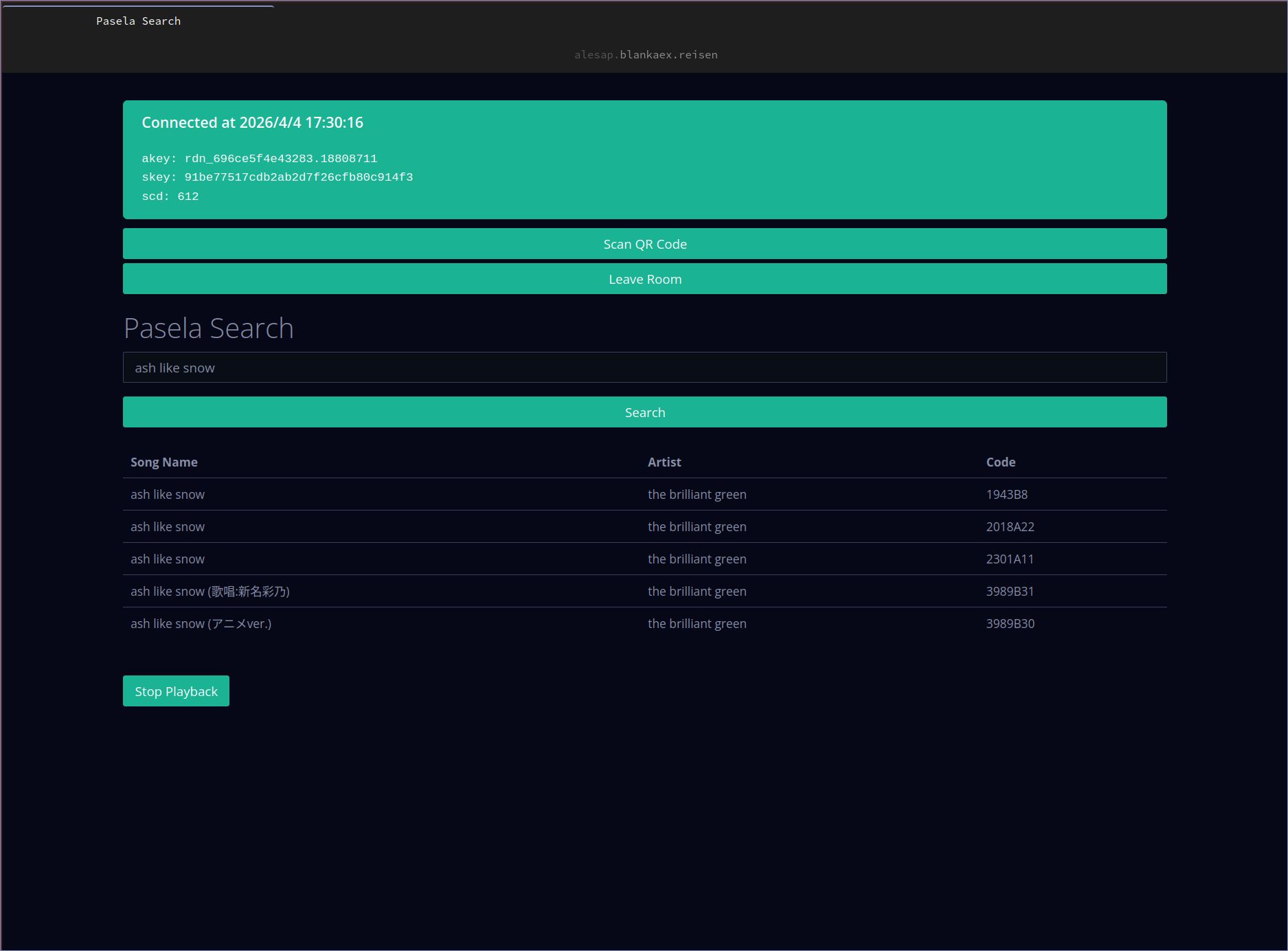 Well we found out very quickly where the values from the QR code go. Looks like they’re session identifiers so that the app knows which machine in which store to send requests to. My guess is scd is “store code”, and akey and skey are related to the session. ecd is one we haven’t seen before but we were able to quickly verify that this is just the song ID. You can see this for yourself via the online search: